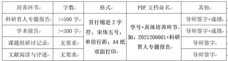 按照各专业研究生培养计划,“学术报告”、“课题组研讨活动”与“文献阅读与评述”环节,每学期完成的次数应不低于本专业要求的总次数的学期平均数(总次数/学期数),现对2021年培养环节活动场次/文献篇数完成进度要求如下: