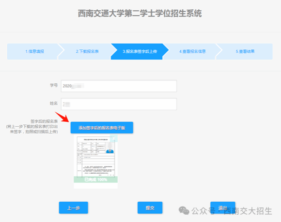 6.上传报名表:《午夜av 2024年第二学士学位报名表》在承诺人处签字后,拍照或扫描为清晰照片,点击“添加签字后的报名表电子版”进行上传,上传成功后点击“提交”完成报名。