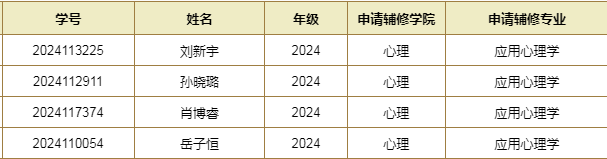 根据《午夜av 本科生辅修专业修读及辅修学位授予管理办法》和《2025年辅修专业招生通知》,经学生本人网上申请,教学工作组进行审核,结合招收人数,拟同意刘新宇等4名学生辅修应用心理学专业申请,现予以公示。