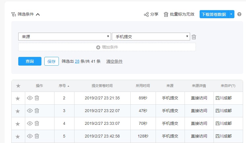 ②与论文所述匹配的收数据的平台(如问卷星)或软件(如E-prime)的后台截图,截图后粘贴至word提交。截图需显示问卷名称及份数,及被试来源截图。例如: