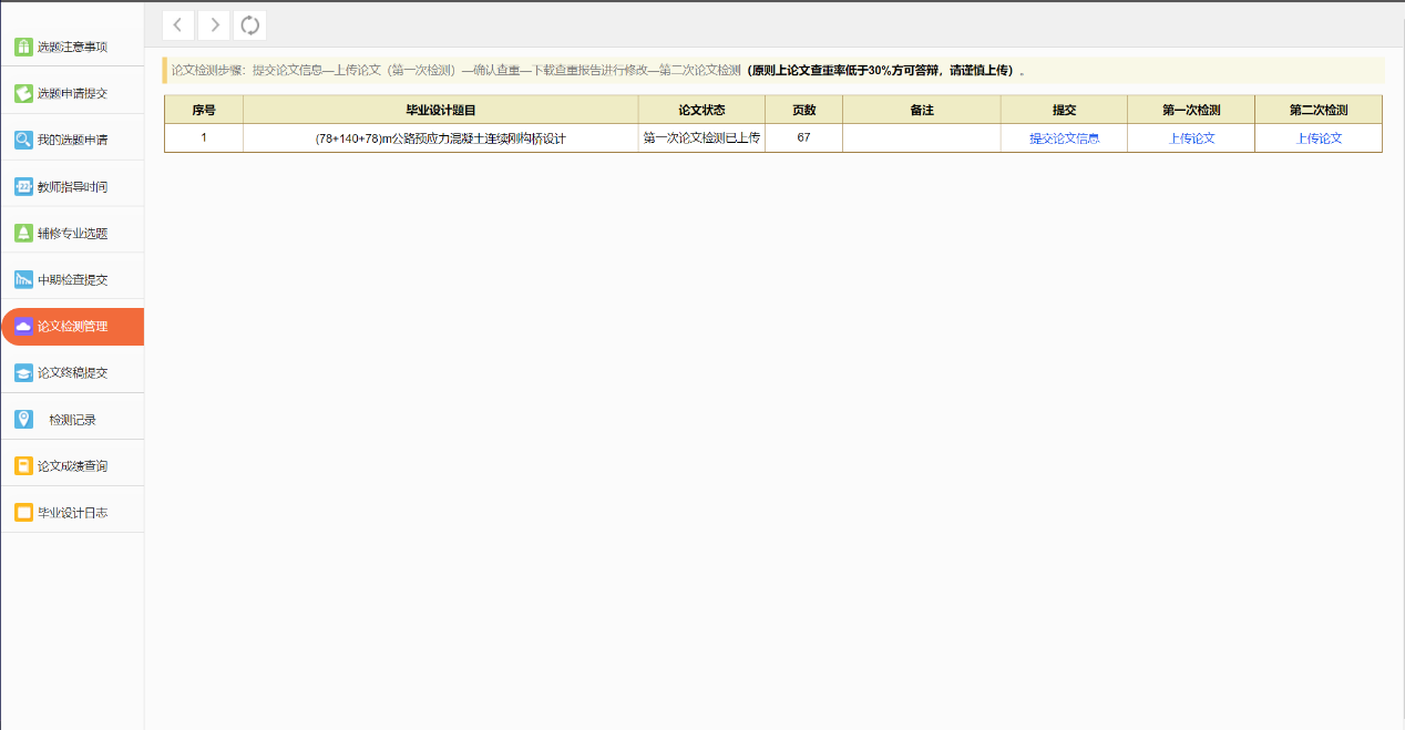 在论文检测管理中—提交论文信息—上传论文(第一次检测)—选择文件—第一次论文检测确认查重—下载报告进行修改—第二次论文检测(论文查重率低于30%,AIGC检测率低于30%方可答辩,请谨慎上传)。