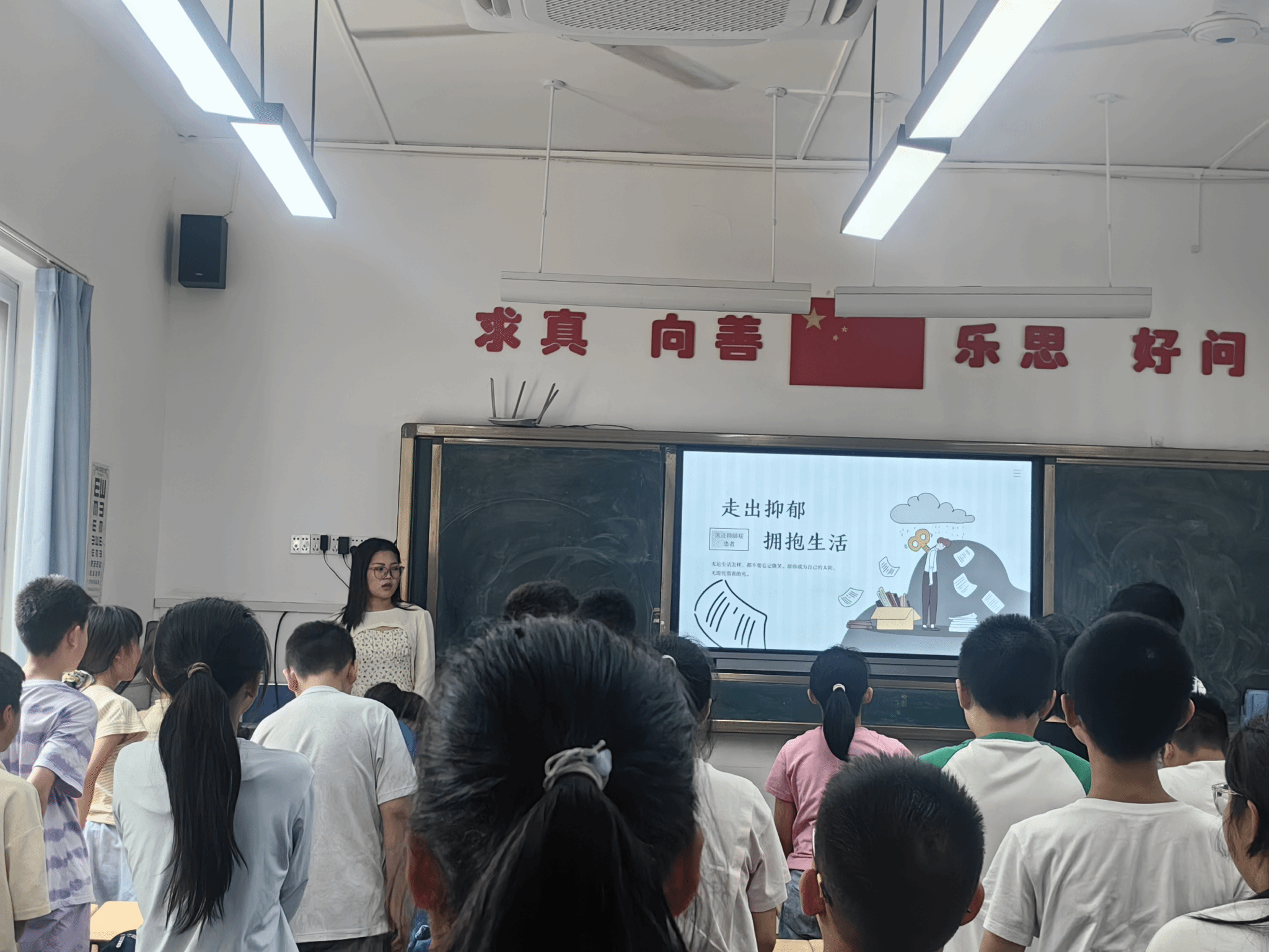 之后,老师还介绍了生活方式调整在抑郁症治疗中的作用。她告诉孩子们,保持健康的生活习惯,如规律作息、均衡饮食、适度运动等,对缓解抑郁症状非常有帮助。她还鼓励孩子们多参加社交活动,与亲朋好友保持联系,分享彼此的快乐和烦恼。