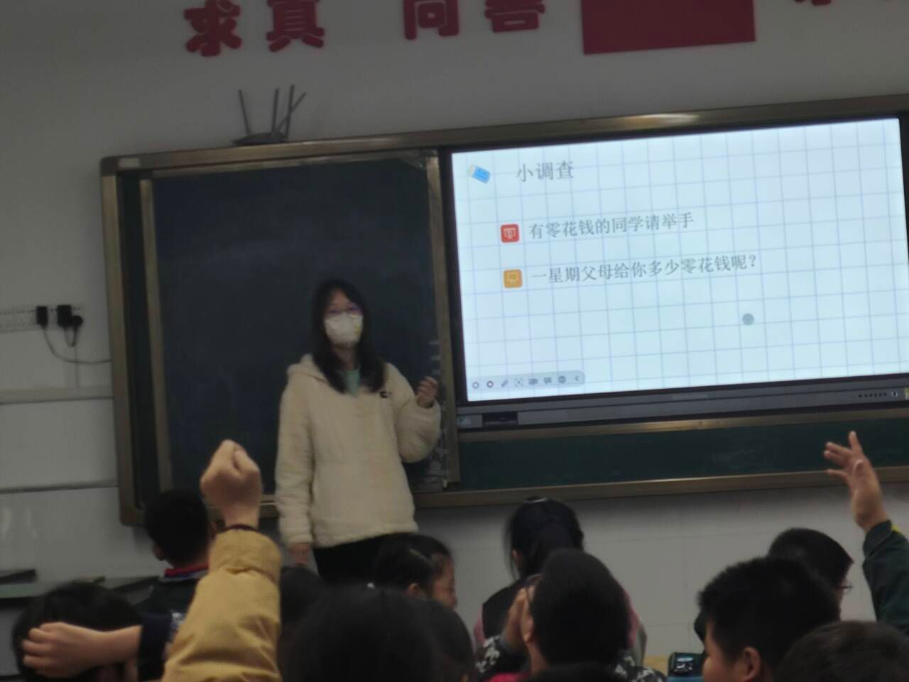 本次课堂开始,老师以同学们每周的零花钱和零花钱的使用情况等互动问题引入,了解了大家对零花钱的支配情况。接着以一个互动小视频导入,活跃课堂氛围,调动同学们的积极性和课堂参与度。同学们跟随视频中的手势,学会了手势舞,大家对本次课堂产生了浓厚兴趣。