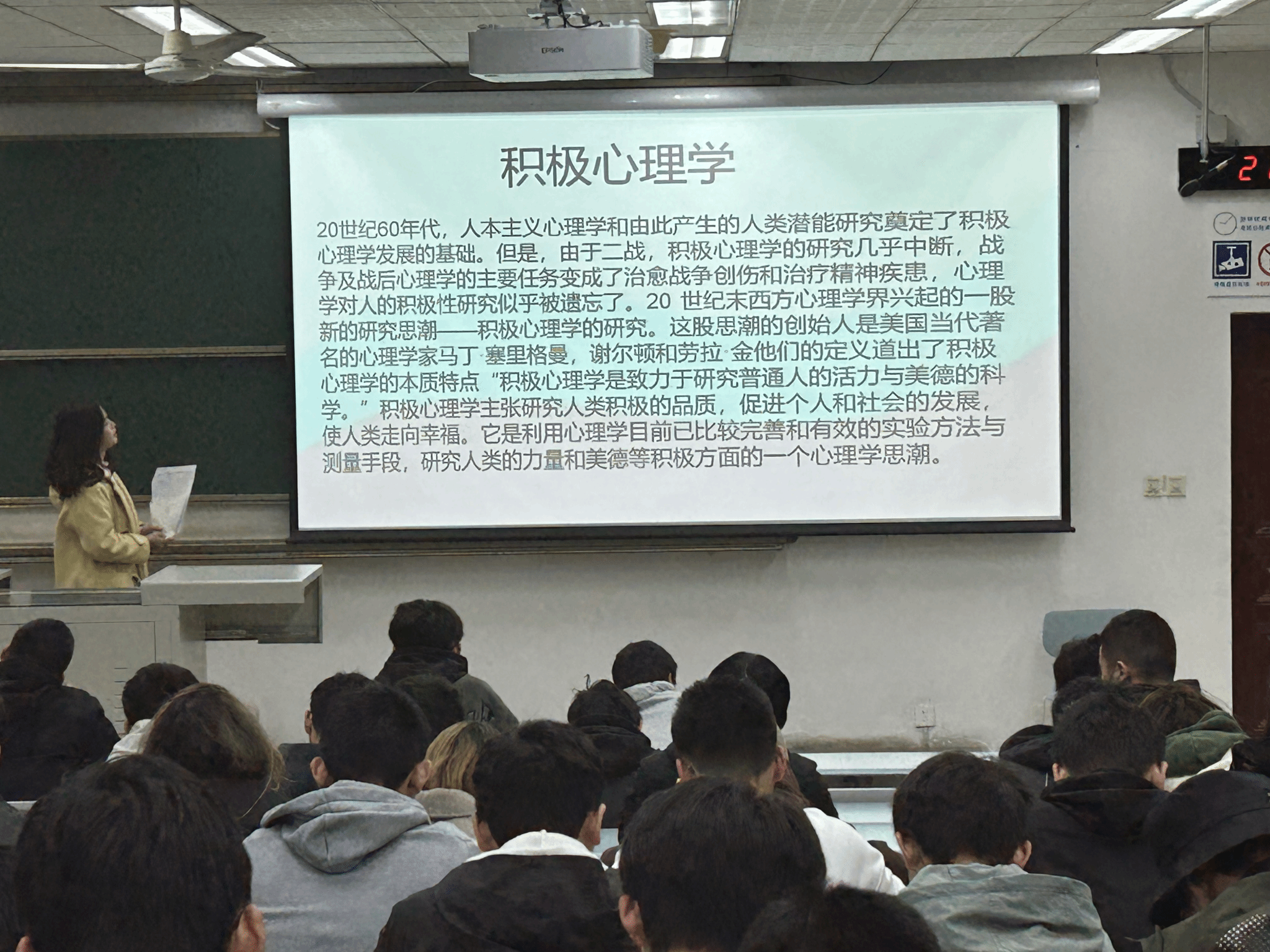 下一位主讲人沈宁静同学则从另一个角度出发,告诉我们如何去应对生活中的压力和焦虑。首先,她以与变态心理学相对的积极心理学出发,为我们介绍了什么是积极心理学“积极心理学是致力于研究普通人的活力与美德的科学。积极心理学主张研究人类积极的品质,促进个人和社会的发展,使人类走向幸福。”积极心理学中有着我们如何活得幸福以及应对压力和焦虑等心理问题的秘诀,主讲人同时为我们推荐了有关积极心理学的书籍。