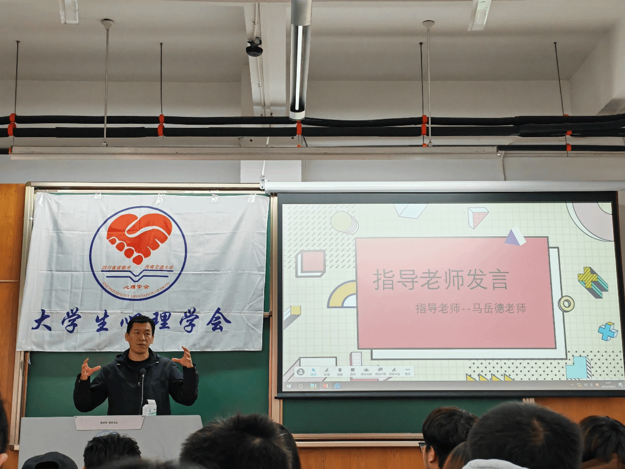 大会第二项,由大学生心理学会指导老师马岳德老师进行讲话,马老师对学会进行了简单的介绍,他指出心理学会是一个历史悠久且做出过优秀成绩的社团组织,曾获得过许多荣誉称号,是交大成立最早、人数最多、影响最大的优秀校级社团。走过了二十八年的风风雨雨,马老师鼓励第二十八届的心学新成员们追寻前辈们的足迹,以饱满的热情投入心学的发展建设,不断锻炼自我,提升自我。