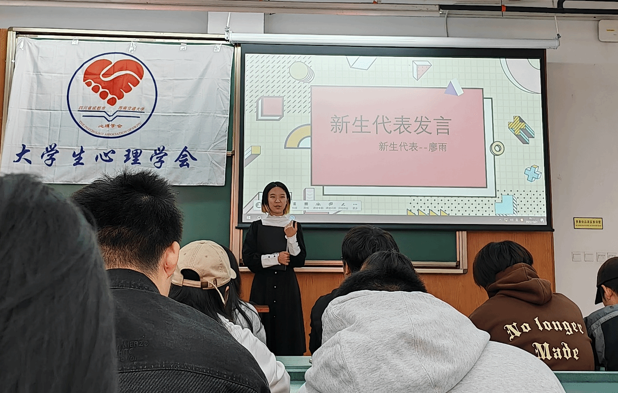 然后,2023级外国语学院廖雨同学作为新生代表进行发言,她表示自己对心理学充满兴趣,对加入心学这个大家庭充满喜悦,刚加入进来便有了很好的收获,在情景剧部的近期学习和体悟中发掘出了自己的潜能,并积极履行了青年的责任。在发言的最后,她展望心理学会的美好未来,希望自己能于大家一起与心学共进步。