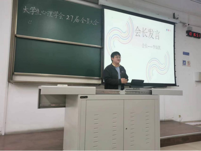 随后,心理学会会长李灿凯发言,会长以风趣幽默的语言向大家解析了心理学会的精神内涵和存在意义:帮助别人。就像给子弟小学的学生上课,举办朋辈心理辅导技能大赛,办线上树洞等等。使大家对心学的理解更上一个台阶。