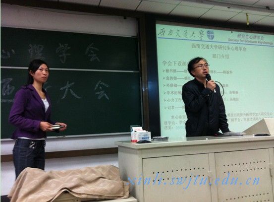 2、由学术部部长朱海玲主持本次招新大会,介绍了研究生心理学会的发展概况,组成部门,学会宗旨等主要内容。