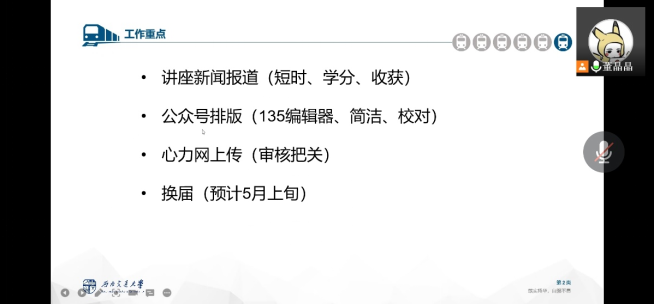 本次会议通过讲座新闻报道、公众号排版、心力网上传三个方面对心传媒的成员进行了培训,并强调了换届的相关事宜。